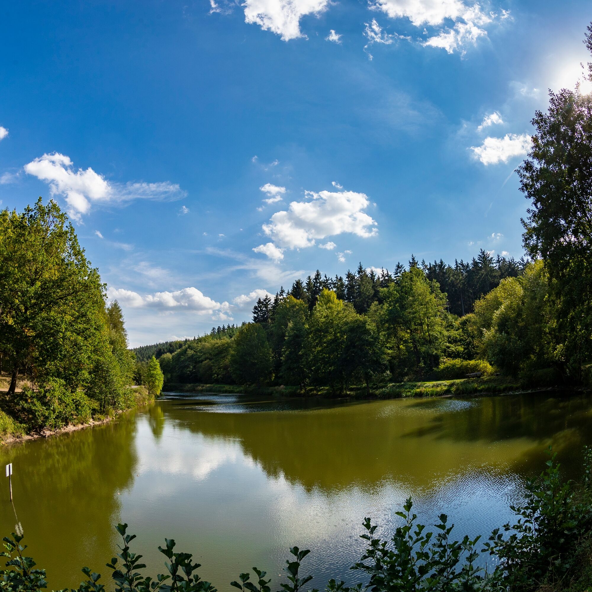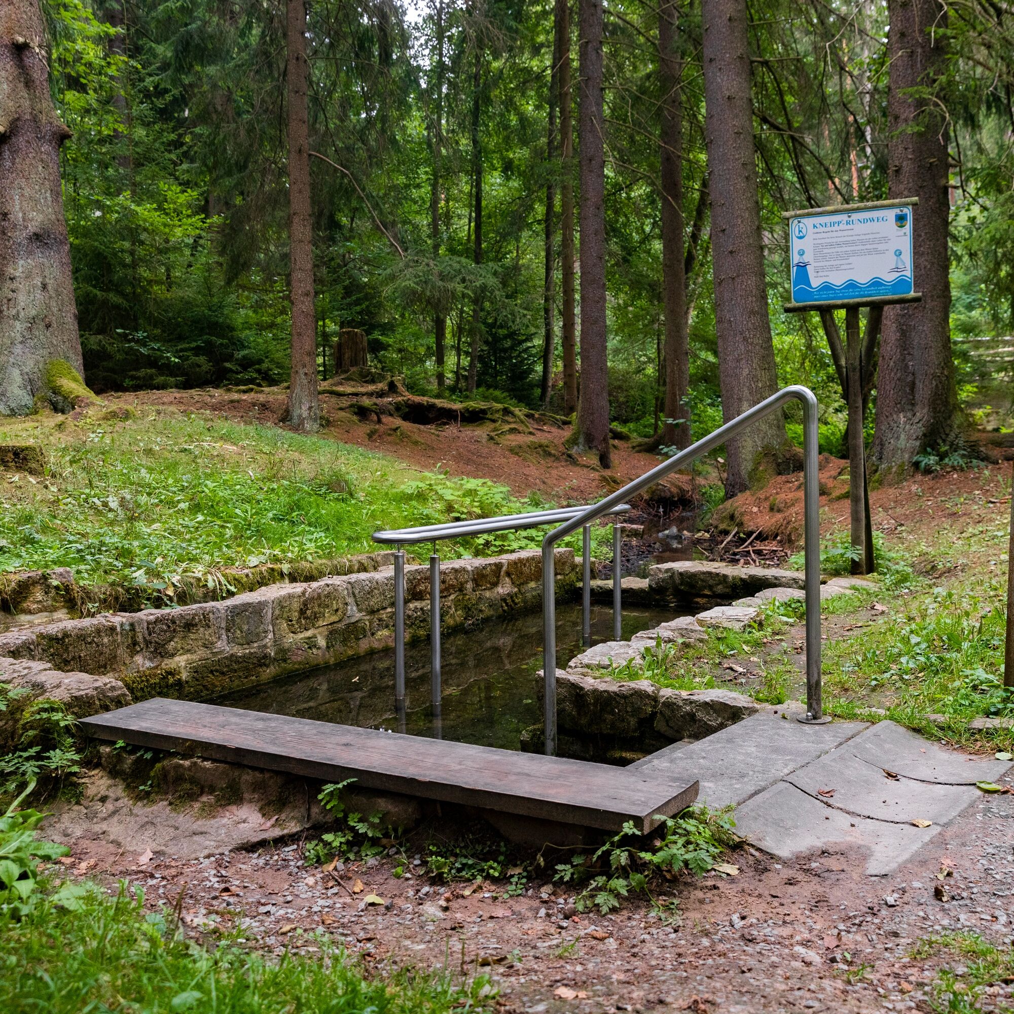 The start is at the Kneipp facility at the Goethe Fountain at the Tourist Information Bad Berka. From there, via Ilmstraße and Parkstraße to Blankenhainer Straße. At the pedestrian traffic light, the Blankenhainer Straße is crossed, and the path leads along Trebestraße. After 1.2 km, it goes right behind the community center of the Catholic Church into the forest, and the path leads via a trail almost to the Bad Berka sports field. As soon as the trail meets an asphalt path, we turn left onto this asphalt path and follow it to the entrance of Dreiteichsgrund. Here there is a grill hut and a resting place. Because the Ilm Valley Cycle Path also runs on this way, you encounter many cyclists. At Dreiteichsgrund we turn left into the valley, walk along the three ponds, and reach Carl-Alexander-Platz at km 3. Here is the Kneipp facility Dammbachsgrund with benches as well as the Carl-Friedrich Spring. The asphalt path continues north into Dammbachsgrund, changes into a gravel path, and leads along three other ponds. On the way, you find the Hubertus spring, a shelter, and a spruce planted in 1823. At km 5.5, we leave the gravel path and turn left onto the forest path. We follow this until at km 6 the path continues on a gravel path. Follow this gravel path for about 700 m, then the path turns left into the forest. Here comes a section of forest path that is strongly interspersed with tree roots. Passing the source Gottesbrünnlein with the detour to the Rhododendron Garden Bad Berka, at the Kneipp facility Gottesbrünnlein, and at the natural monument Hertasee, the path meets the former railway line Bad Berka - Blankenhain. Here we stop and turn left and walk along the asphalt path past the outdoor pool, turn right at Trebestraße. At the end of Trebestraße, the path crosses Blankenhainer Straße at the pedestrian traffic light, and the goal of the circular path is reached.