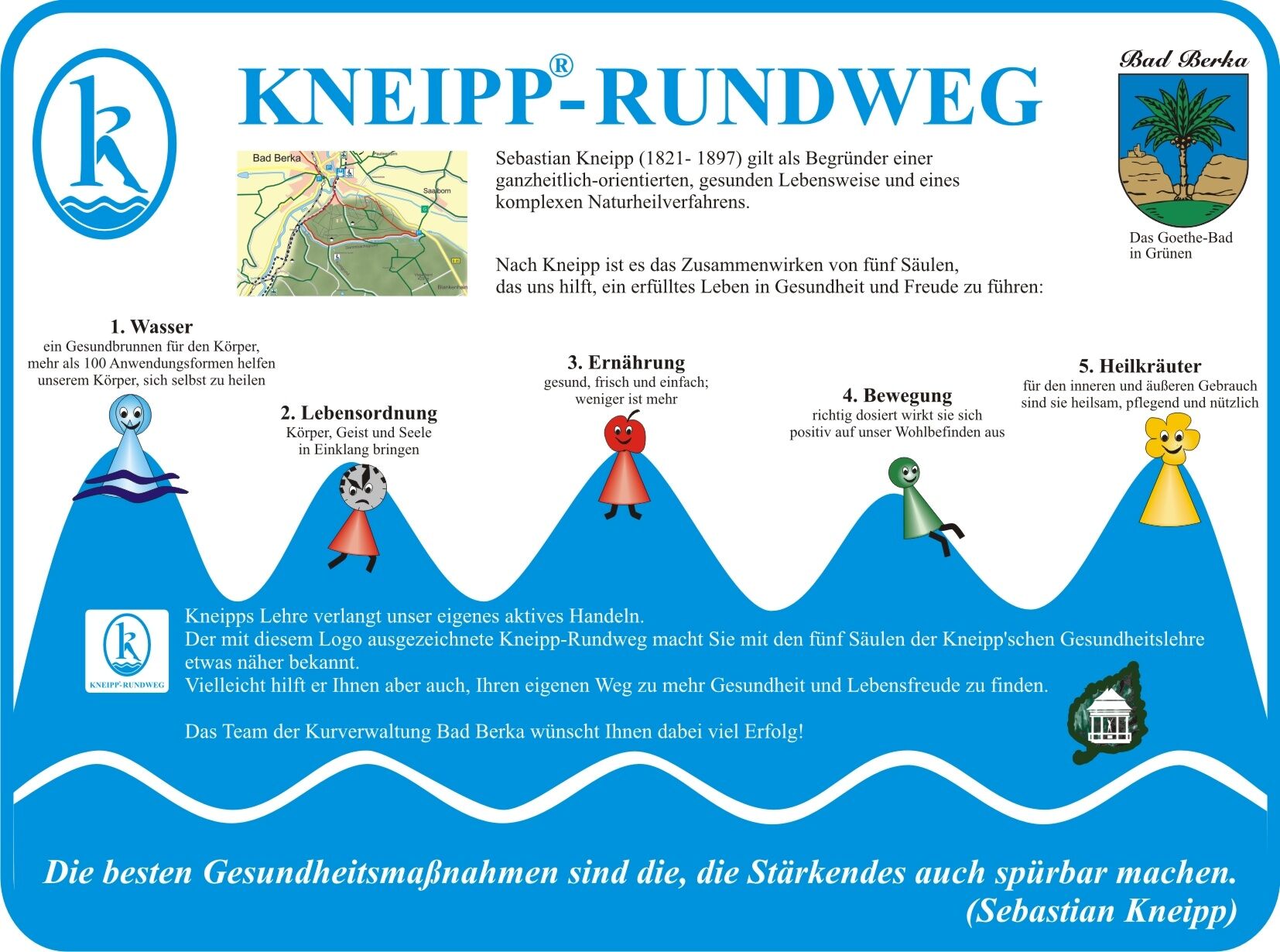 The Kneipp circular route Bad Berka connects the pillars of water and movement of Kneipp's teaching in a beautiful landscape. Along the route, you will find information about the 5 pillars of Kneipp's...